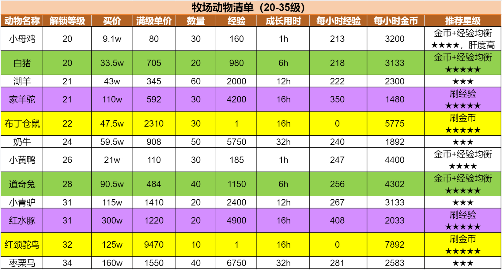 贴心的星妹已经将不同等级可解锁的动物数据汇总在下方的表格中啦!由于动物的成长周期不同,星妹将经验和金币平摊在每小时内,等级区间内每小时最高经验/最高金币动物已高亮显示。星妹给出了综合考量下的推荐星级指数,星宝们可以根据需求自行对比选择哦~
