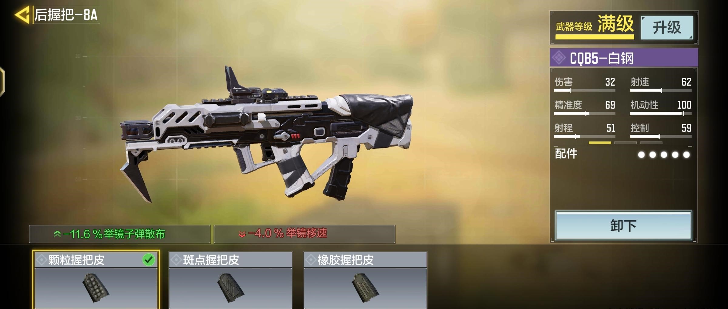 以上我们可以总结出这把枪裸枪情况下散发密集,后坐力小,子弹多,但是伤害衰减,射程偏短,我们可以得出一个配装思路-提升射程,在保持开镜速度机动性不变小的情况下,所以我们要带一个提升机动性的枪托。