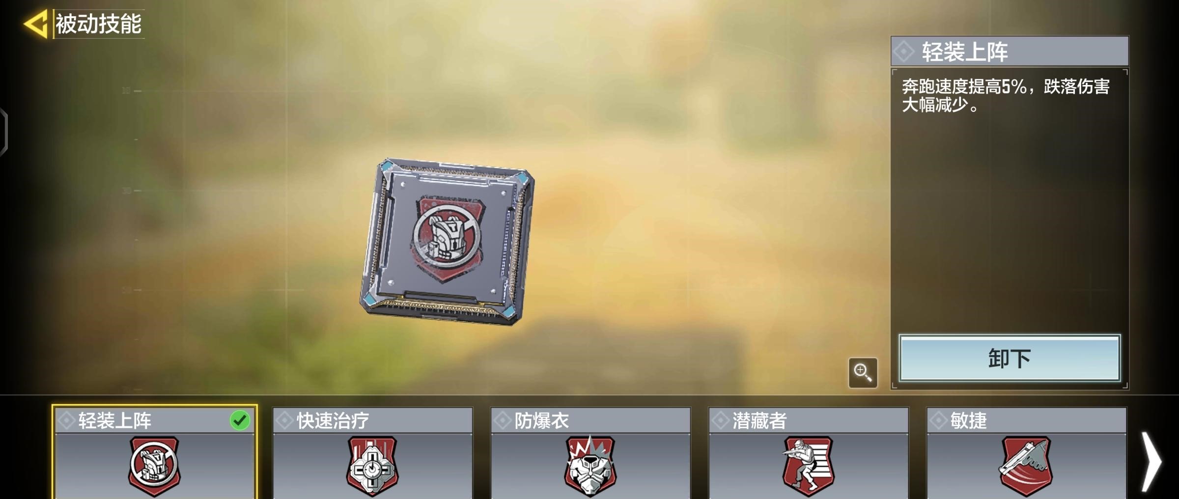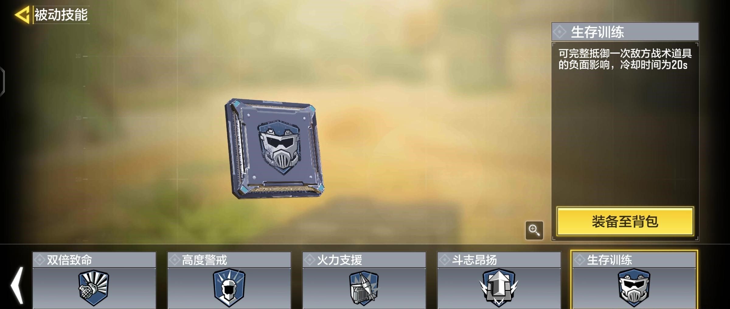 提升了奔跑速度,一定程度上弥补了机动性,也可以带防爆衣,然后呢我们必须冲在前面打头阵,我们得考虑战术道具,所以我选择了生存训练