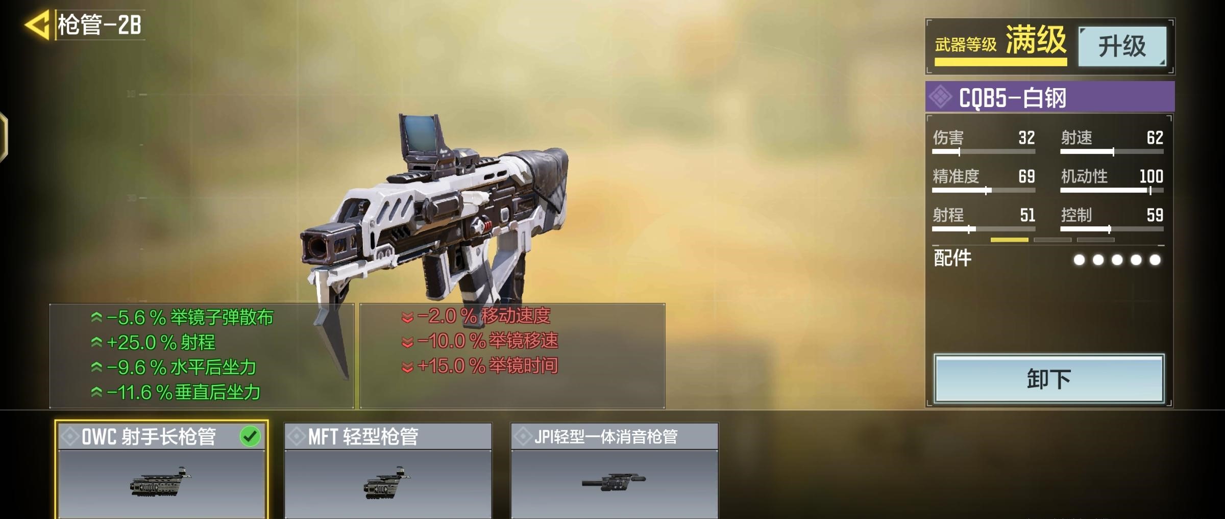 根据上文首先我们得提升射程所以我带了OWC射手长枪管