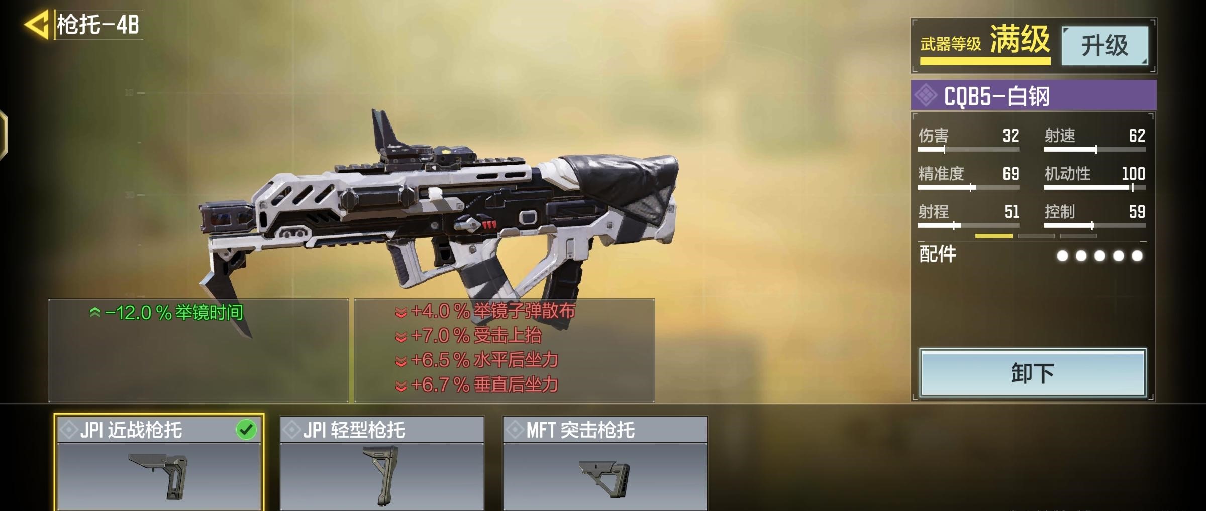 提升了百分之25点射程,减少了举镜子弹散步,增强了控制性,此时开镜速度和移动速度变低所以我们得带JPL近战枪托