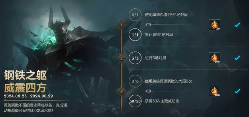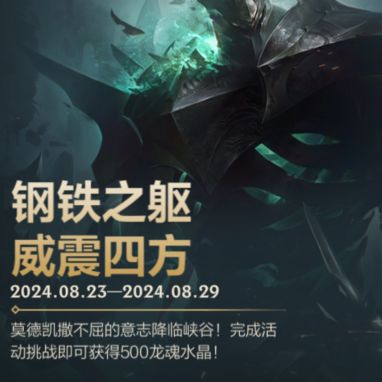 莫德凯撒不屈的意志已降临峡谷!截止至8月29日,召唤师完成活动挑战即可获得龙魂水晶*500奖励~