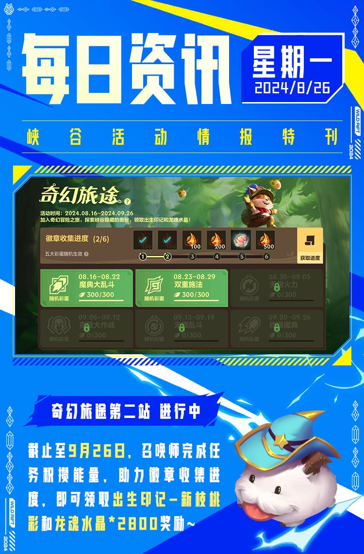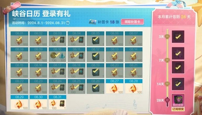 截止至8月31日,召唤师每日登录游戏后,前往峡谷日历签到即可领取好礼~活动期间内,日历签到最多可获得龙魂水晶*2600、蓝色晶石*300及魄罗币*130好礼!