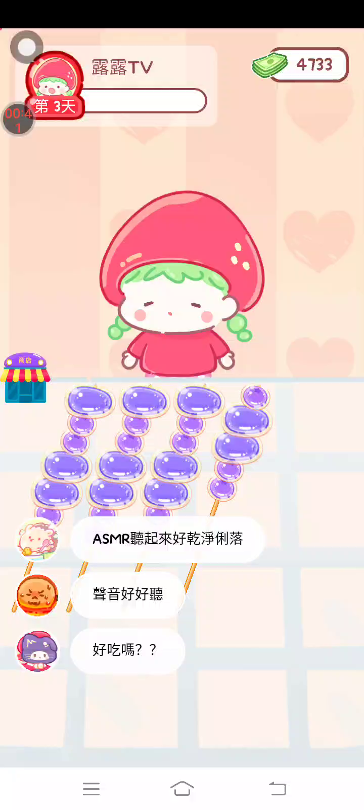 - 冰淇淋摊刚在迷你超市开张了! - 哇 - 高级冰淇淋?!观看广告可获得随机免费一球! - 五种口味?给我最好吃的一个! 制作自己专属的糖葫芦,挑战吃播ASMR吧! 「你进行草莓糖葫芦吃播的话,我就赞助100元。」 「脆口的声音太迷人了(°θ°)」 由于客人都被最近新开的许多糖葫芦店家抢走,曾经号称糖葫芦达人的父母因此卧病在床。 继承父母店面的主角露露开始糖葫芦吃播来宣传店面。 直到成为真正的糖葫芦达人那一天! 「今天我也要开始糖葫芦直播罗!( •o• )」 [串材料] 只有新鲜的水果的话,很难以一名吃播实况主存活下来。还要有松饼、地球软糖、青阳辣椒!利用奇特的材料制作糖葫芦吧。 [裹糖衣] 将材料串满竹签的话,就放进锅子搅动吧。唯有利用达人的秘法,才能裹出又薄又脆的糖衣。 [即时吃播] 咔哒咔哒!今天的吃播也大成功。热烈的聊天内容看起来反应也不错。看来得利用完成观众任务得到的赞助金来买新材料了! 来,准备好了吧?现在就马上挑战成为糖葫芦达人吧!