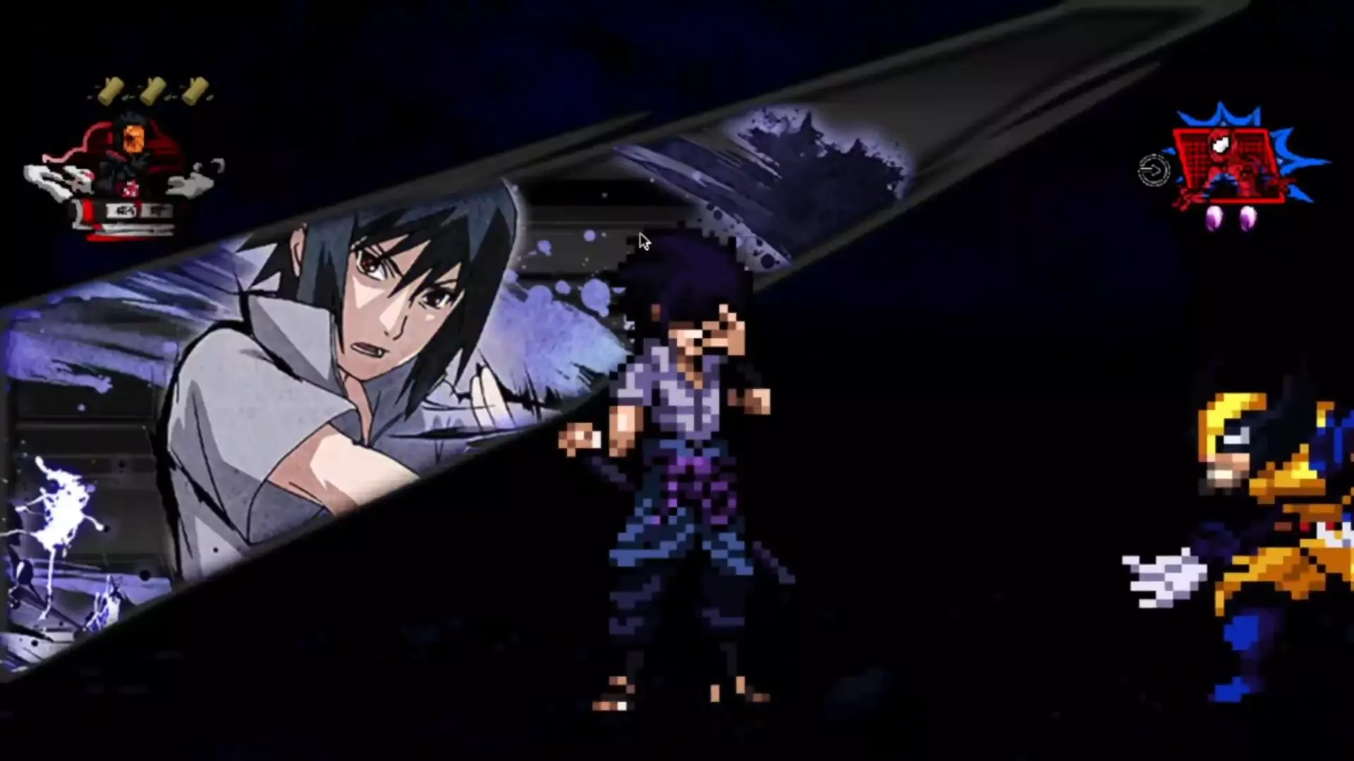 这是一则自制二次元游戏界面效果预告,界面呈现匹配对战样式,选用了《火影忍者》的宇智波佐助、《咒术回战》的两面宿傩等动漫角色,展示了匹配及对战的视觉效果。