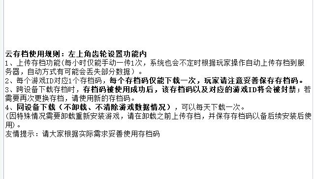该游戏为联网的单机游戏,玩家数据保留在手机本地,无特殊情况请勿随意卸载、清楚游戏数据,特殊情况可以使用存档码功能进行恢复。(存档码规则可进群了解)