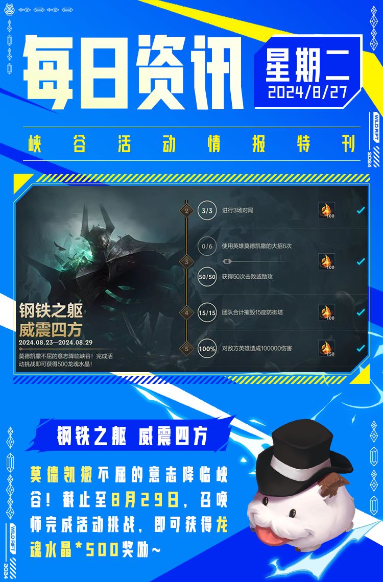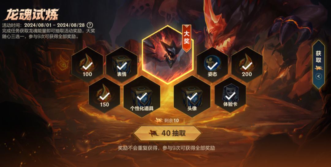 8月龙魂试炼倒计时2天!截止至8月28日(明日),召唤师完成任务获取龙魂能量,即可抽取活动奖励,实现黑曜石守护者 墨菲特、龙魂水晶*3000和专属大奖随心三选一!大奖就在前方,召唤师快抓紧时间完成任务吧~