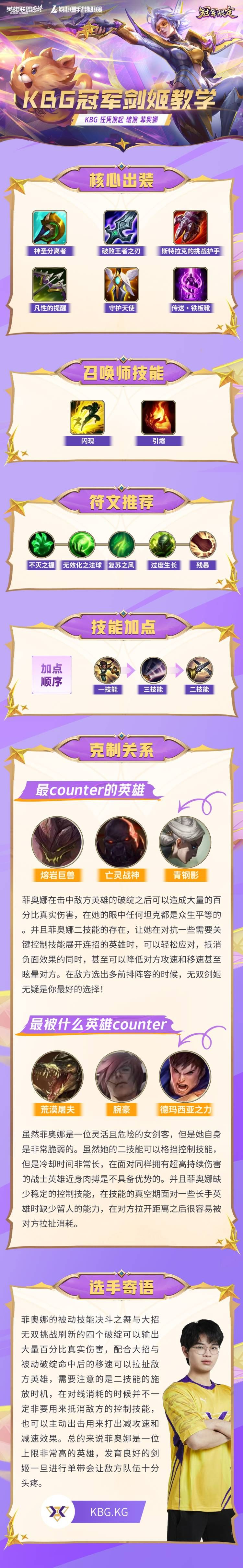 昨天KBG.DaT选手带来的菲奥娜峡谷速成班(点击此处跳转查看),大家都看了吗~隆哥看完可谓是受益匪浅!今天隆哥带着KBG.KG选手的干货前来,召唤师们快收下这份菲奥娜图文教学吧~