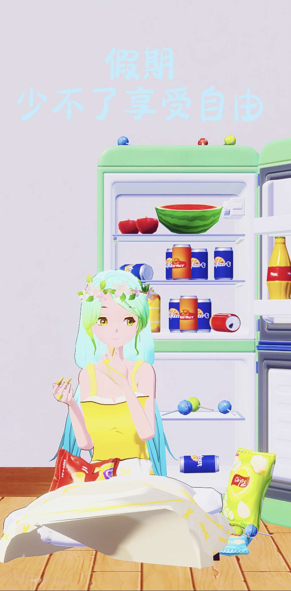 人物特点:头发绿蓝带一点黄色;异瞳,蓝绿或黄绿;衣服准备了三套,分别表示夏季校服、秋季校服和放假的休闲装(这里是夏季休闲装),衣服主色为绿,蓝,黄;鞋子也有三种不同款式