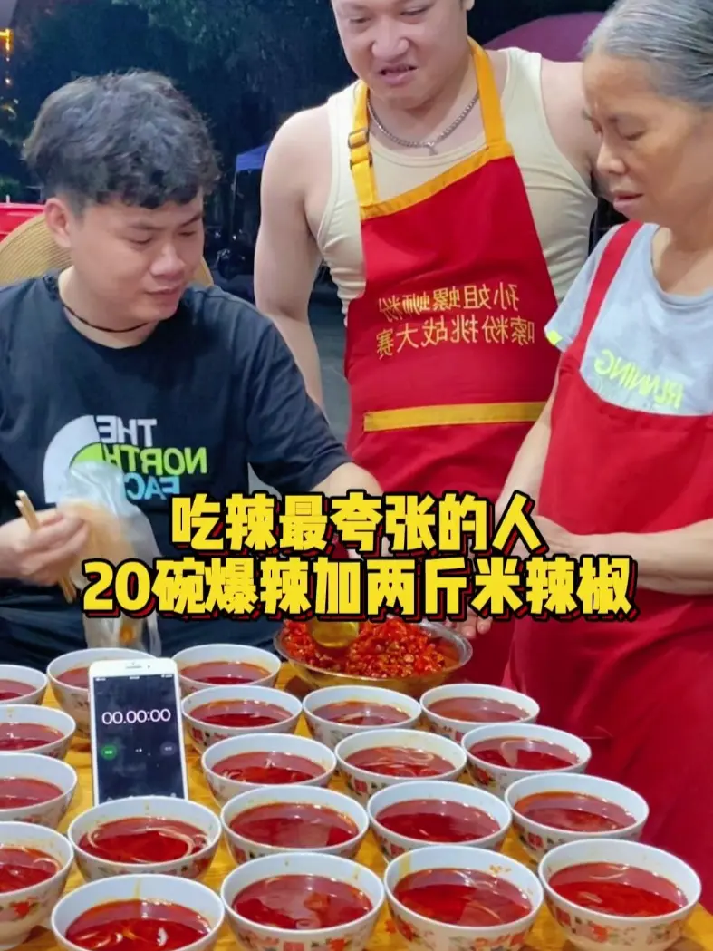 河北大哥参与嗦粉挑战,挑战15碗加三种辣椒的爆辣螺蛳粉,现场进食的场面令人惊叹,展现出超强的吃辣能力与食量。