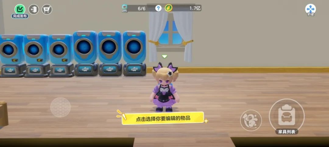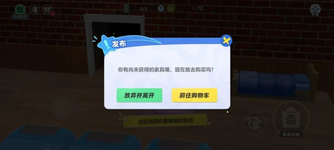 星宝们按照喜欢的风格装扮完小屋后,可以点击左上角的发布按钮,保存当前的小屋装修方案,一定要记得提前在购物车为你的家具买单!