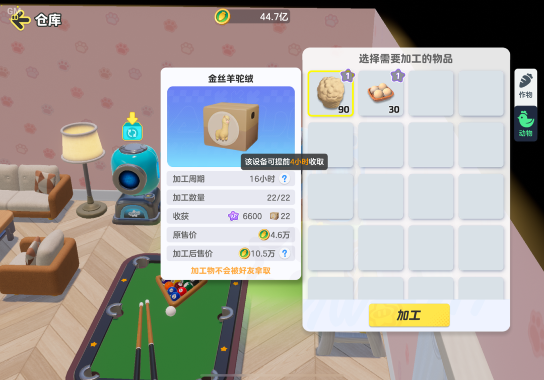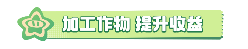 星宝们将想要加工的作物投入加工器,等待一段时间就可以收获啦!加工时长由作物的成熟时长决定,与牧场一样,可以提前1/4的时间收获。