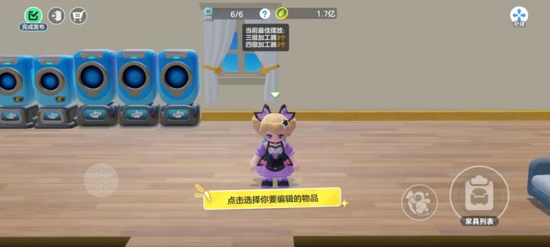 星宝们如果不知道如何搭配加工器,可点击屏幕上方加工器标志后的问号,查看当前等级的最佳摆放推荐。PS:初始附赠的【1级加工器】可以在装修界面回收替换高等级加工器!