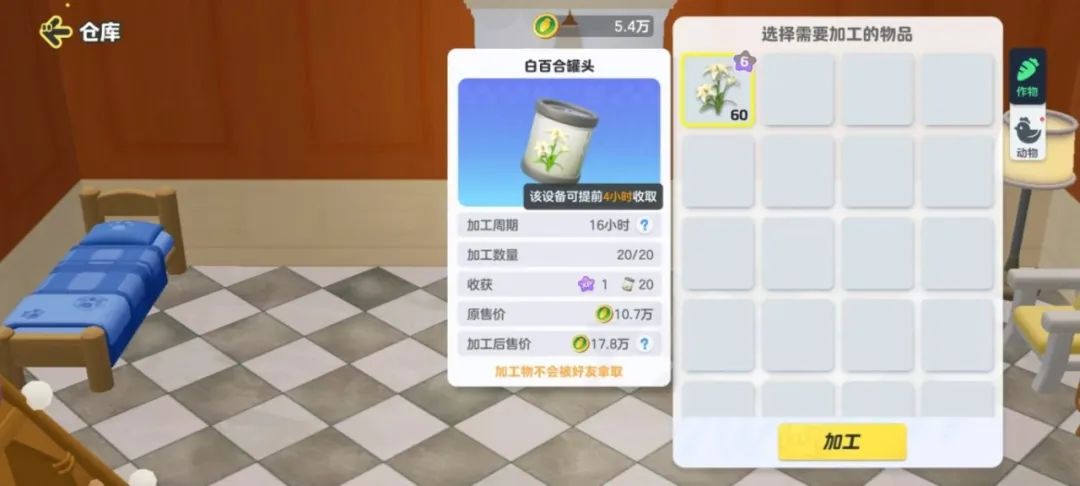 投入加工器的作物品种,决定了加工品最后的收益方向。所以!星妹的建议是:缺钱的星宝可以加工经济作物,缺经验的话就“猛攻”经验作物哦!