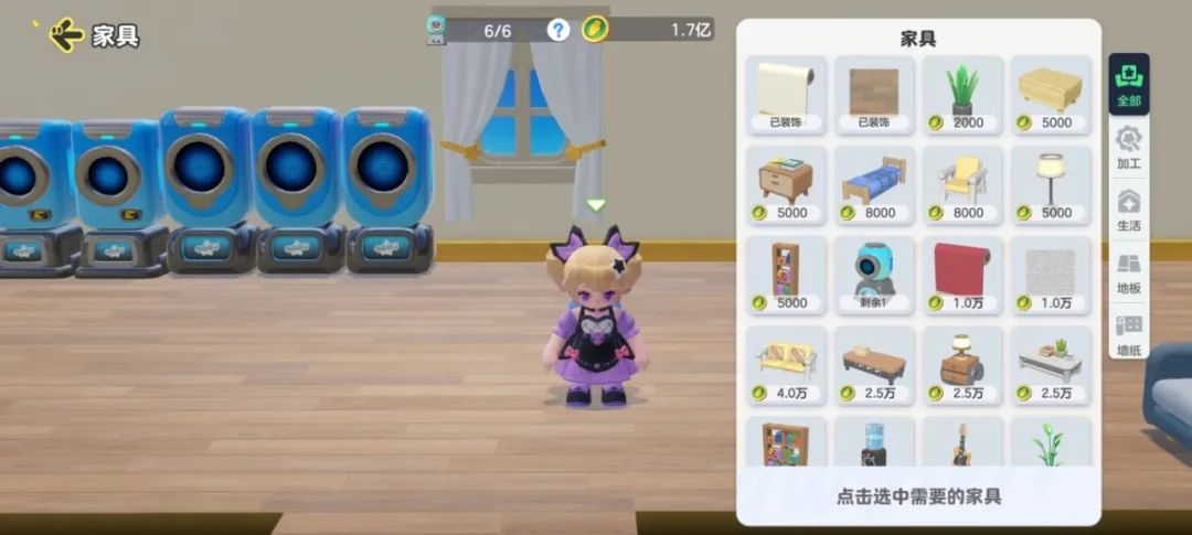 目前家具可分为加工、生活、地板和墙纸四大类!除加工器之外,其余三种类型家具,几乎都有多种颜色供星宝选择。不过要注意的是,这些家具并不能为大家加经验,只能起到装饰的目的!