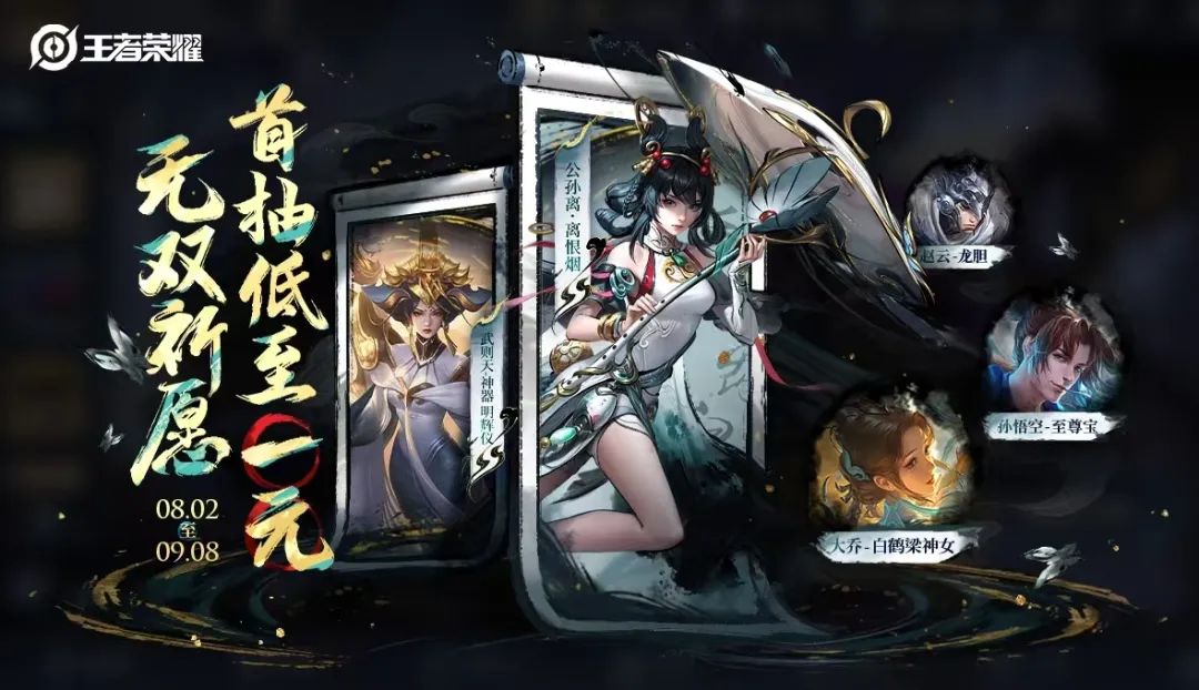 公孙离-离恨烟、武则天-神器·明辉仪、孙悟空-至尊宝、大乔-白鹤梁、赵云-龙胆等皮肤等你来~