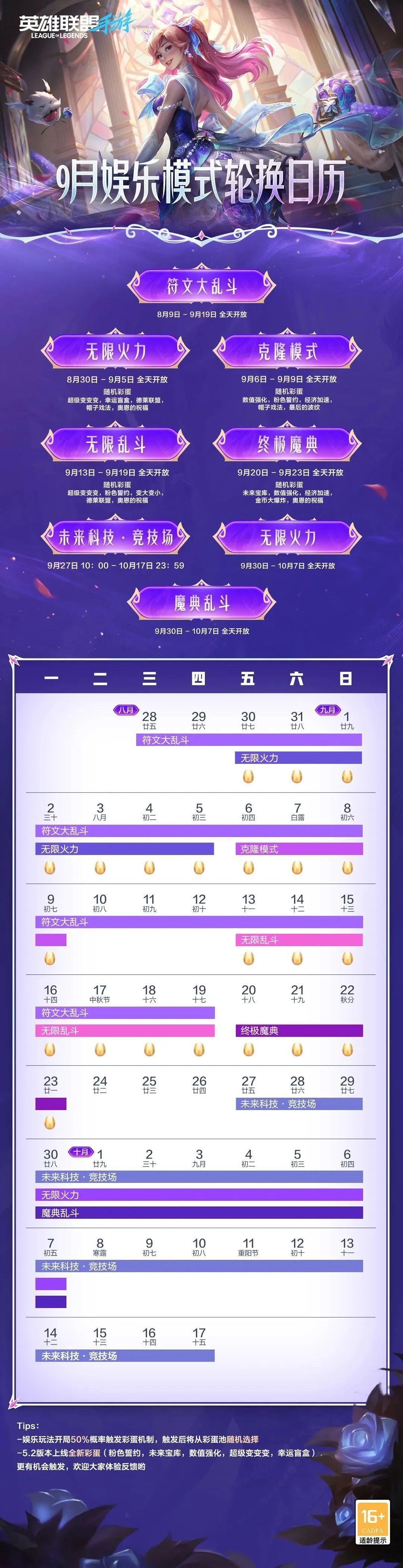 跟着这份9月娱乐模式轮换日历走,各式乐趣全拥有!截止至9月5日,无限火力模式限时全天开放,众多彩蛋随机掉落,花式整活~与此同时,符文大乱斗也在全天开放中,召唤师们尽情享受符文搭配带来的对局快感吧!