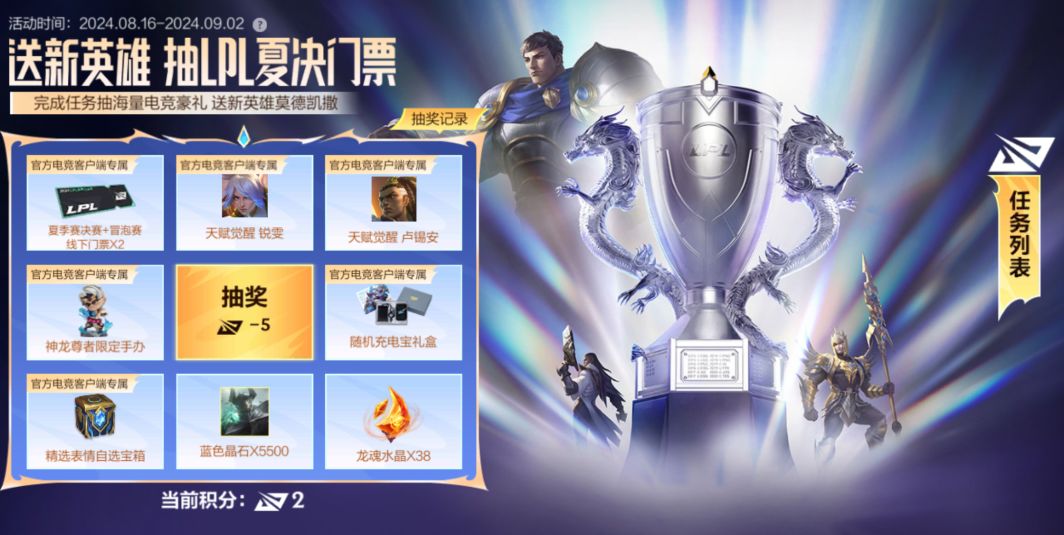 奖励:夏季赛决赛+冒泡赛线下门票*2,天赋觉醒 锐雯,天赋觉醒 卢锡安,神龙尊者限定手办,随机充电宝礼盒,精选表情自选宝箱,蓝色晶石,龙魂水晶