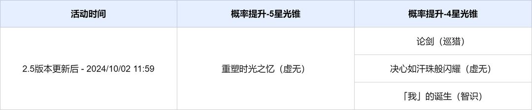本期光锥活动跃迁时间为 2024/9/10 2.5版本更新后 - 2024/10/02 11:59,包含如下内容: