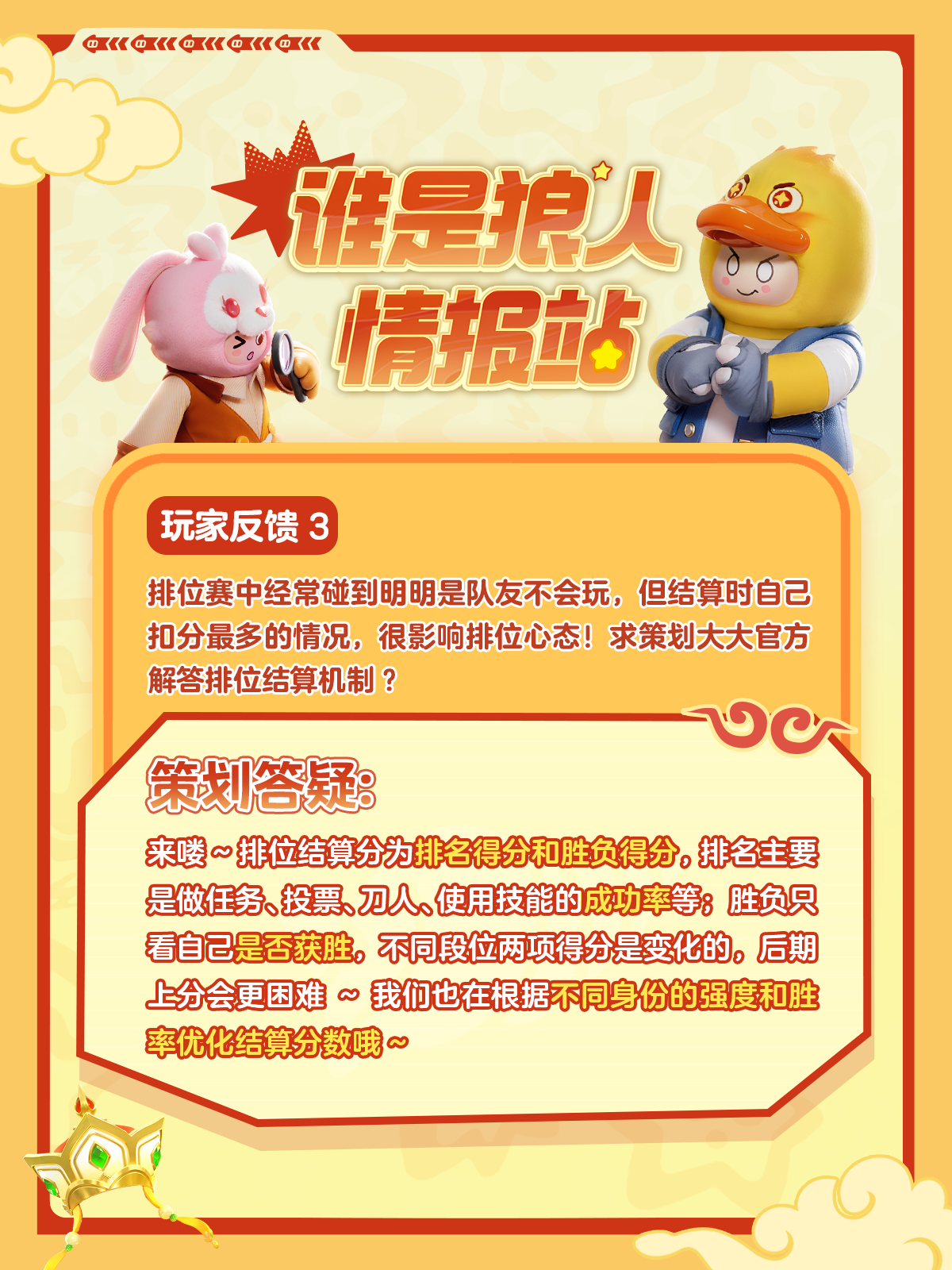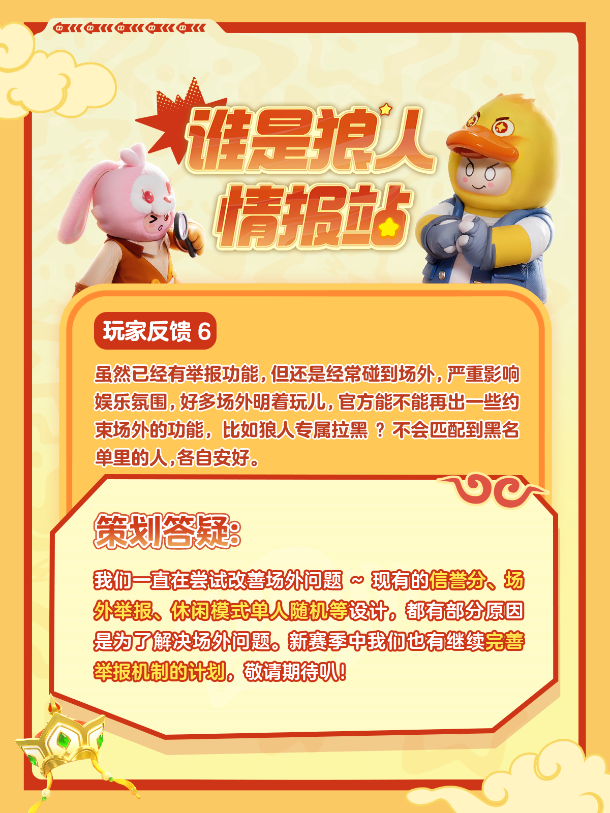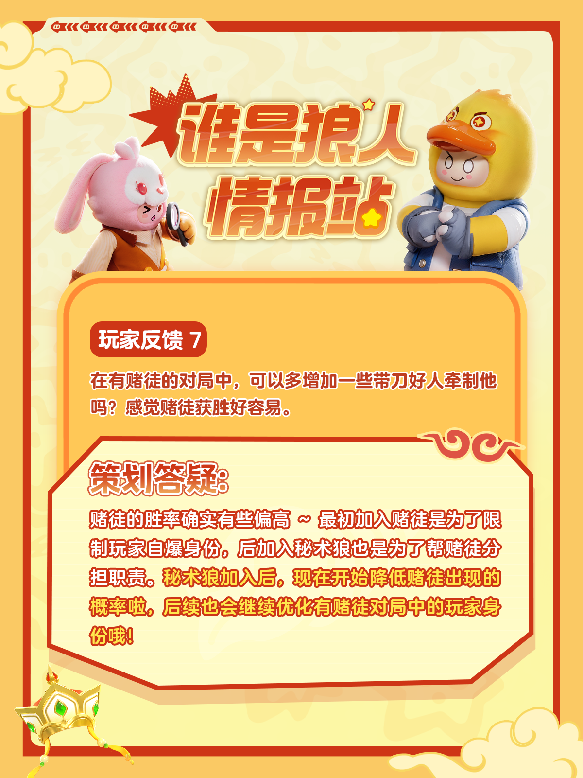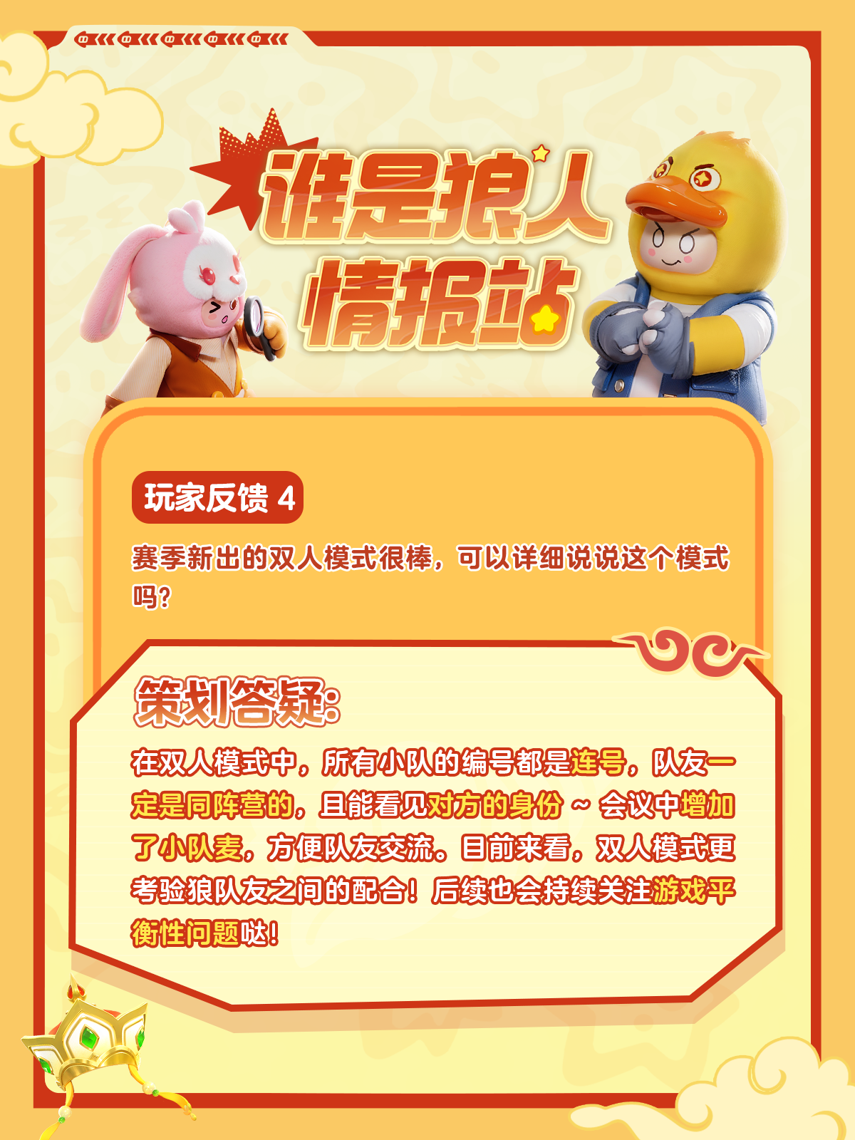 【谁是狼人】新身份新模式上线后,星宝们有很多疑问想要了解,星妹整理了一些大家好奇的问题,找策划大大答疑解惑,快来一起看看吧~