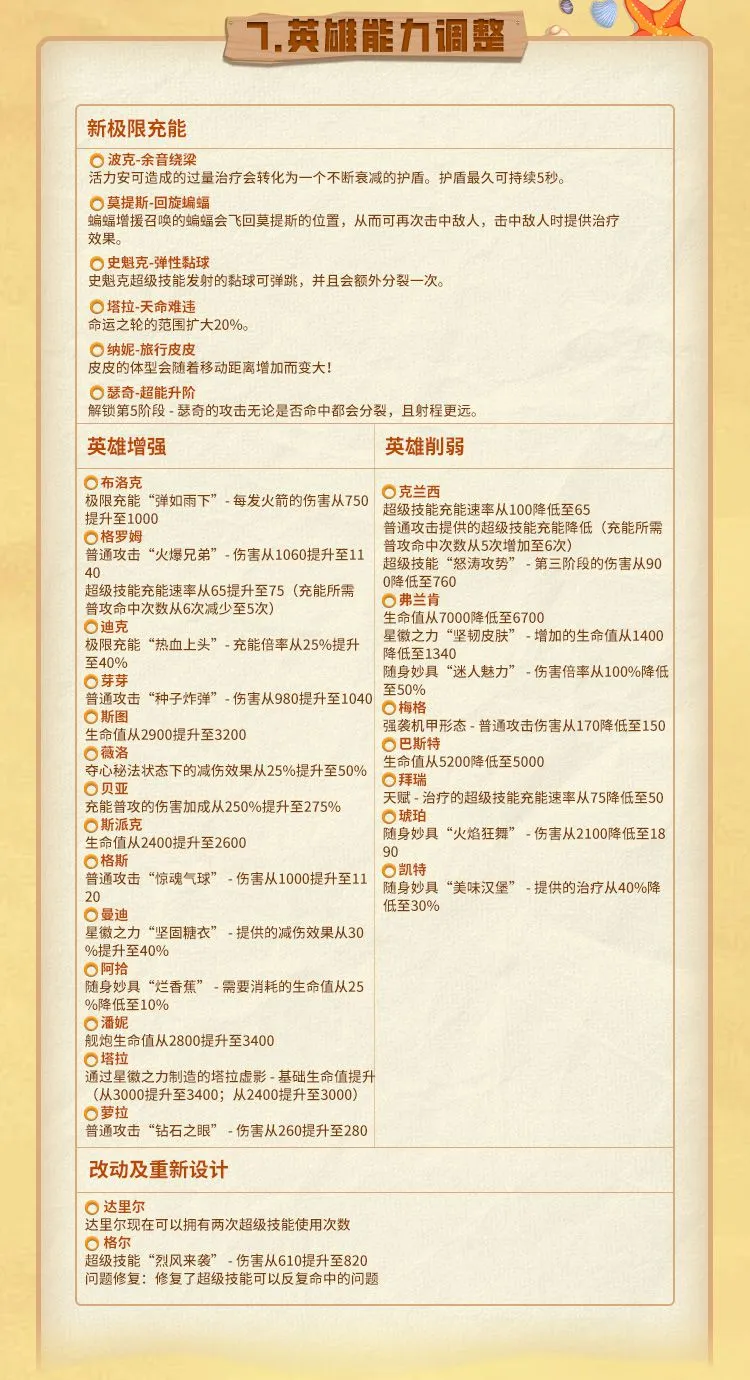 六位英雄获得了新的极限充能,还有大量英雄改动,来看看你的本名英雄,有无加强或是削弱吧!具体改动细节如下