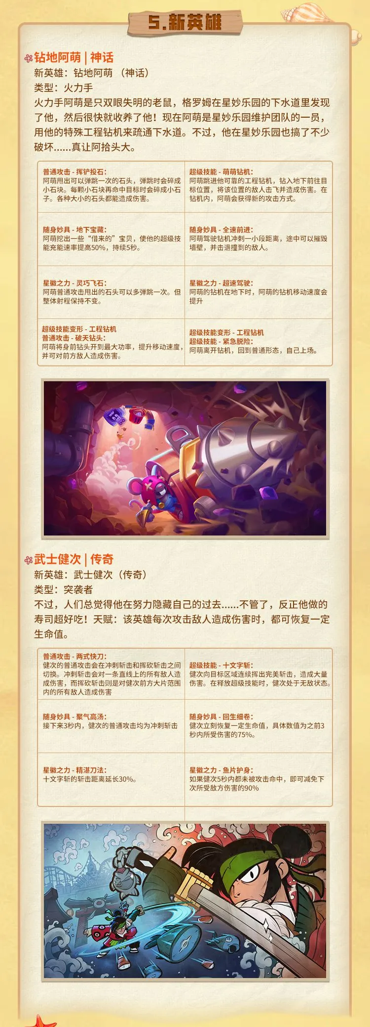 两位全新英雄来袭,神话英雄火力手「钻地阿萌」与传奇突袭者「武士健次」等待你的召唤!详情技能如下