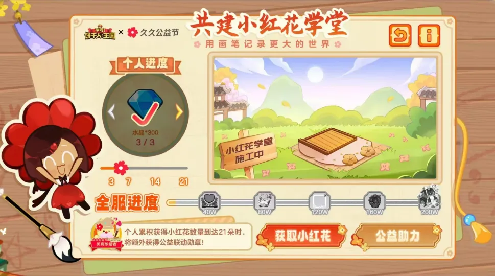 当个人累计获得小红花数量达到3、7、14和21时,将会分别解锁水晶*300、宝物扭蛋券*3、精致饼干模具*3和魔法饼干模具*3的奖励。