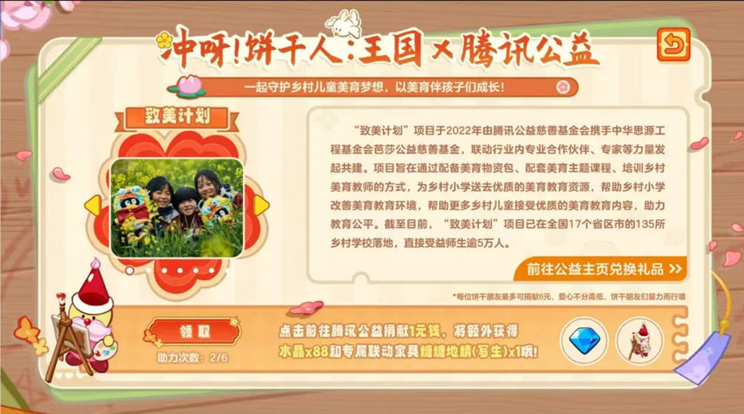 饼干朋友们还可以根据自身情况,选择为致美计划捐款1元助力,每名饼干朋友最多可进行6次捐款,捐款成功后还可以领取水晶*88和联动装饰「糖糖地精(写生)」*1奖励。
