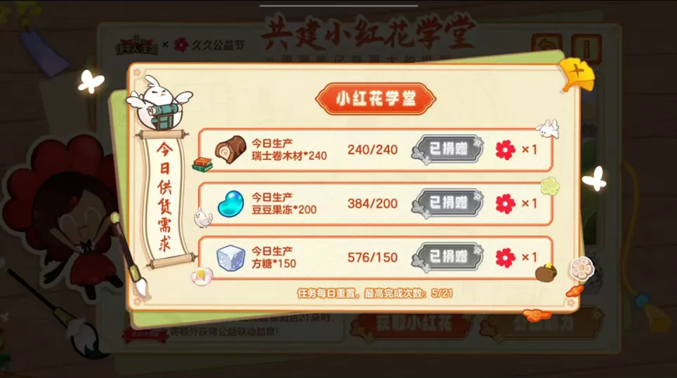 点击【获取小红花】弹出弹窗,通过完成游戏内指定生产任务可以即可获得小红花,点击“捐赠”后,将可以获得一朵小红花,并且同步到个人进度和全服进度中。活动期间,每日刷新三个任务,每位饼干朋友最多可以完成21个任务,获得21朵小红花。