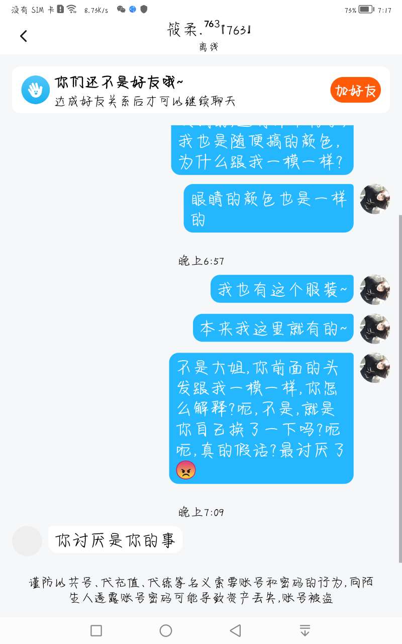 我不想说,明明是她试穿我衣服,还狡辩,前面拉黑过了,让我加回来,又把我拉黑