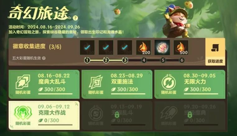 即日起至9月9日,克隆大作战模式全天开放,随机彩蛋惊喜掉落!奇幻旅途第四站同步开启,截止至9月26日,召唤师完成任务积攒能量,即可助力徽章收集进度,领取出生印记-新枝桃彩和龙魂水晶*2800奖励~