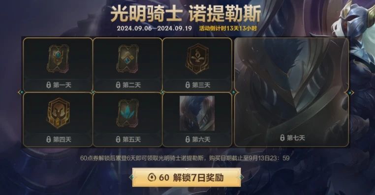即日起至9月19日,召唤师使用60点券解锁活动后,除3胜双倍经验卡、全英雄畅玩卡、法师英雄畅玩卡等奖励外,累计登录6天即可领取皮肤光明骑士 诺提勒斯,累计登录7天还可获得姿态-镇压!
