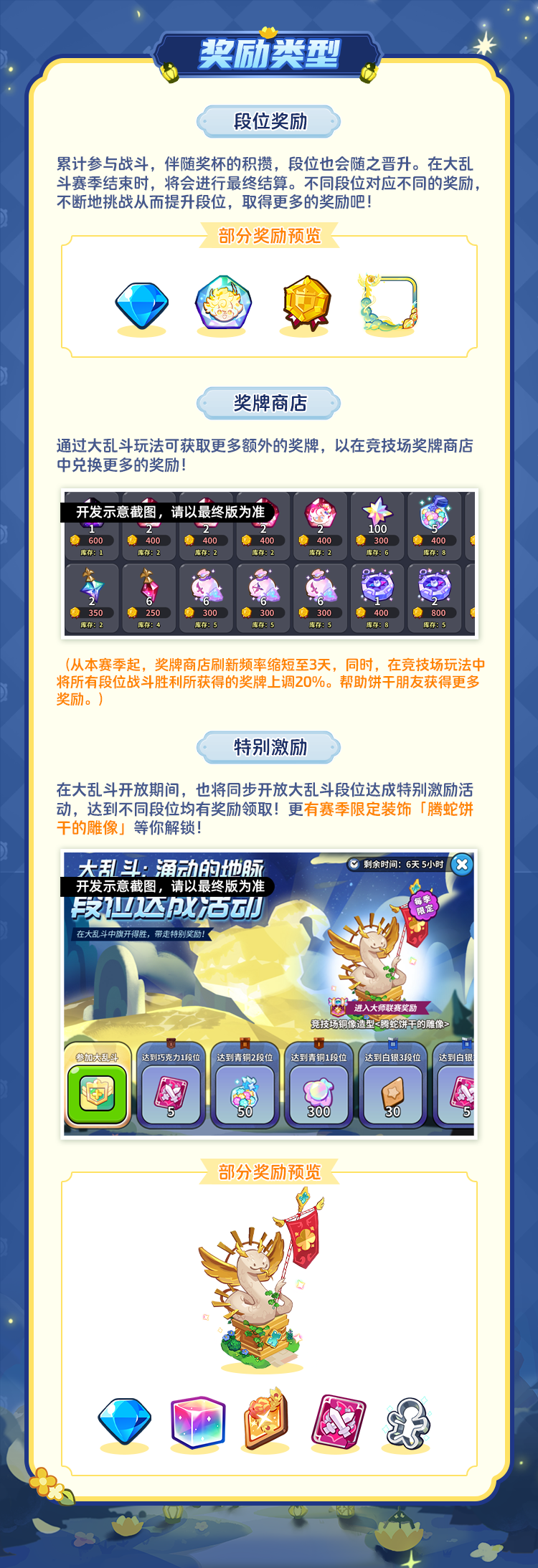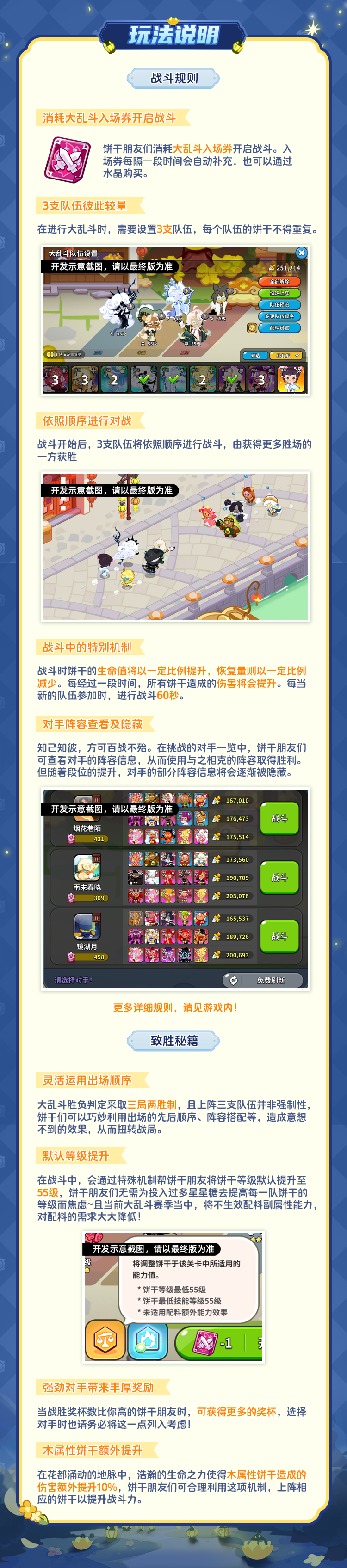 (小Tips:本次大乱斗玩法除了将出战饼干的等级进行提升外,将不生效配料副属性能力,大大降低了饼干朋友们的养成需求!更多致胜秘籍,请见一览长图~)