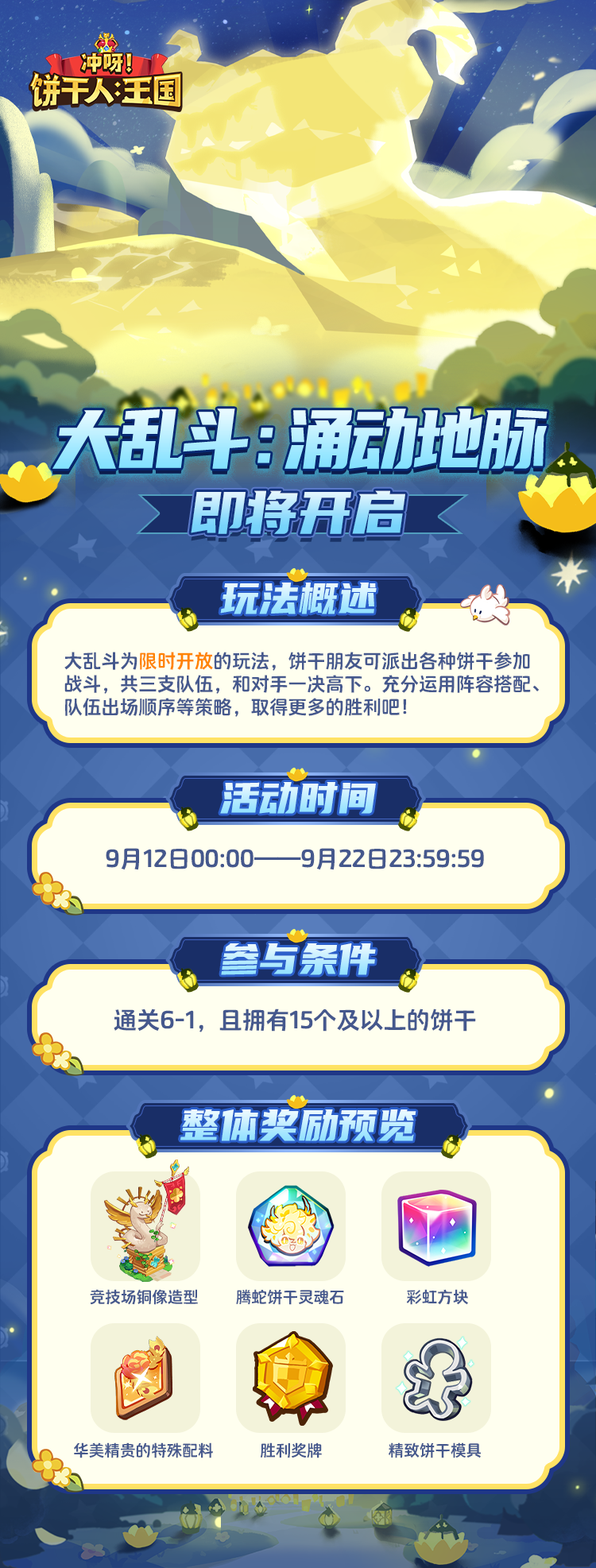 限时玩法「大乱斗:涌动地脉」将启!饼干朋友们可派出各种饼干参加战斗,和对手一决高下!充分运用阵容搭配、队伍出场顺序等策略,取得更多胜利吧!