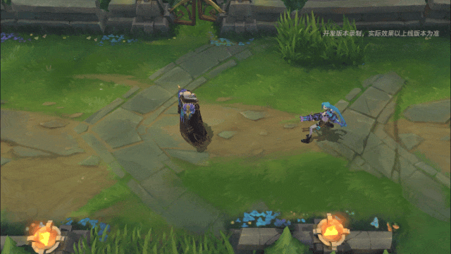 洛施放Q(1)技能时,投掷出一枚孔雀尾状的荧光色羽毛,路径上带有多彩渐变的拖尾特效,命中敌人后自身脚下会浮现一圈由藤蔓和花瓣组成的符印。