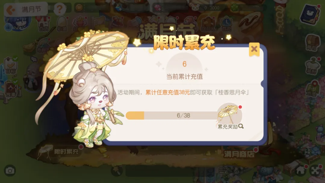 活动期间,累计任意充值38元即可获取「桂香思月伞」。