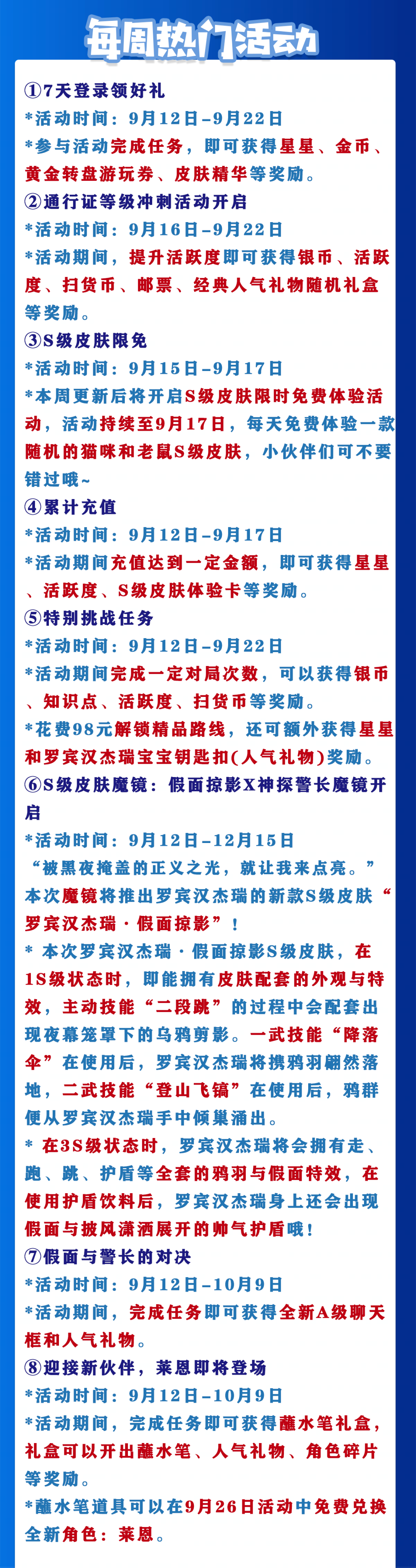 *活动期间充值达到一定金额,即可获得星星、活跃度、S级皮肤体验卡等奖励。