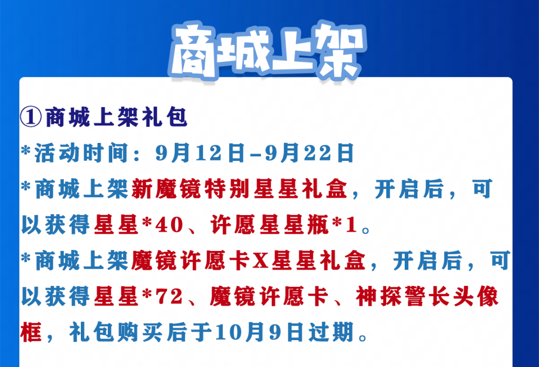 *商城上架魔镜许愿卡X星星礼盒,开启后,可以获得星星*72、魔镜许愿卡、神探警长头像框,礼包购买后于10月9日过期。