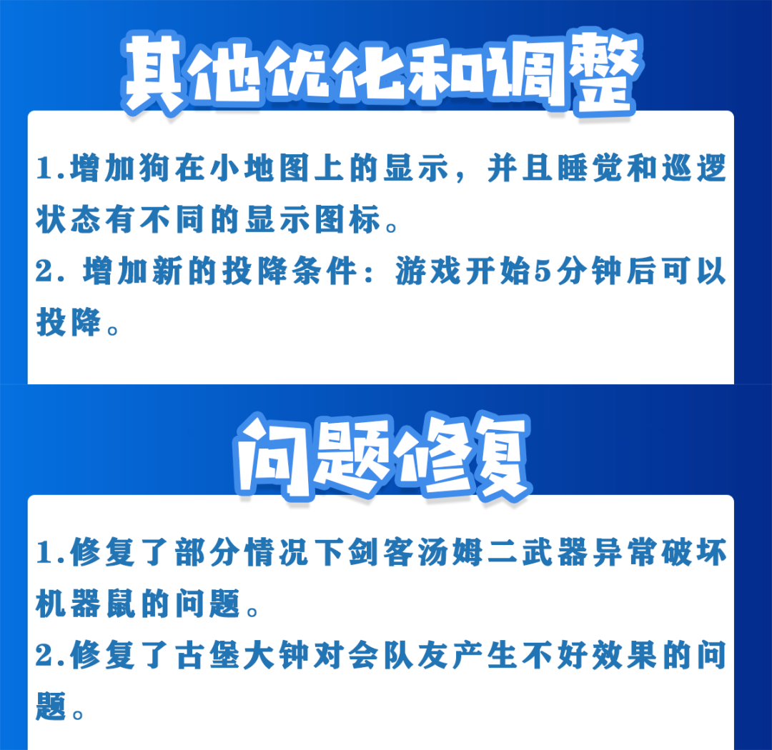 1.修复了部分情况下剑客汤姆二武器异常破坏机器鼠的问题2.修复了古堡大钟对队友产生不好效果问题