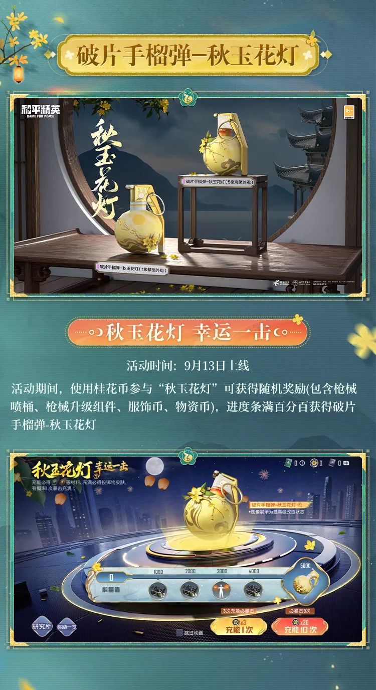 中秋佳节即将来临,明月高高悬挂,破片手榴弹-秋玉花灯将于9月13日上线。