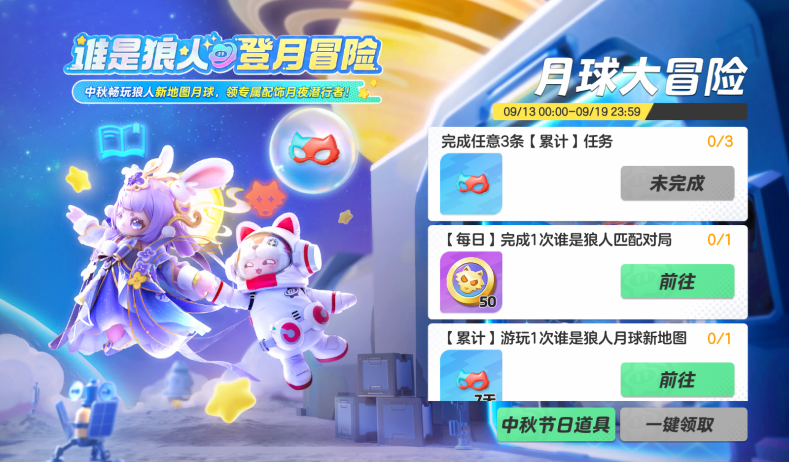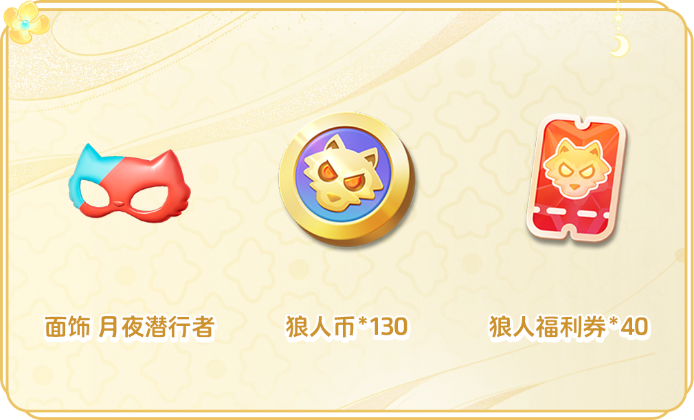 9月13日-9月19日期间,完成谁是狼人模式对应任务,可获得面饰 月夜潜行者、狼人币*130以及狼人福利券*40用以兑换绝版身份。