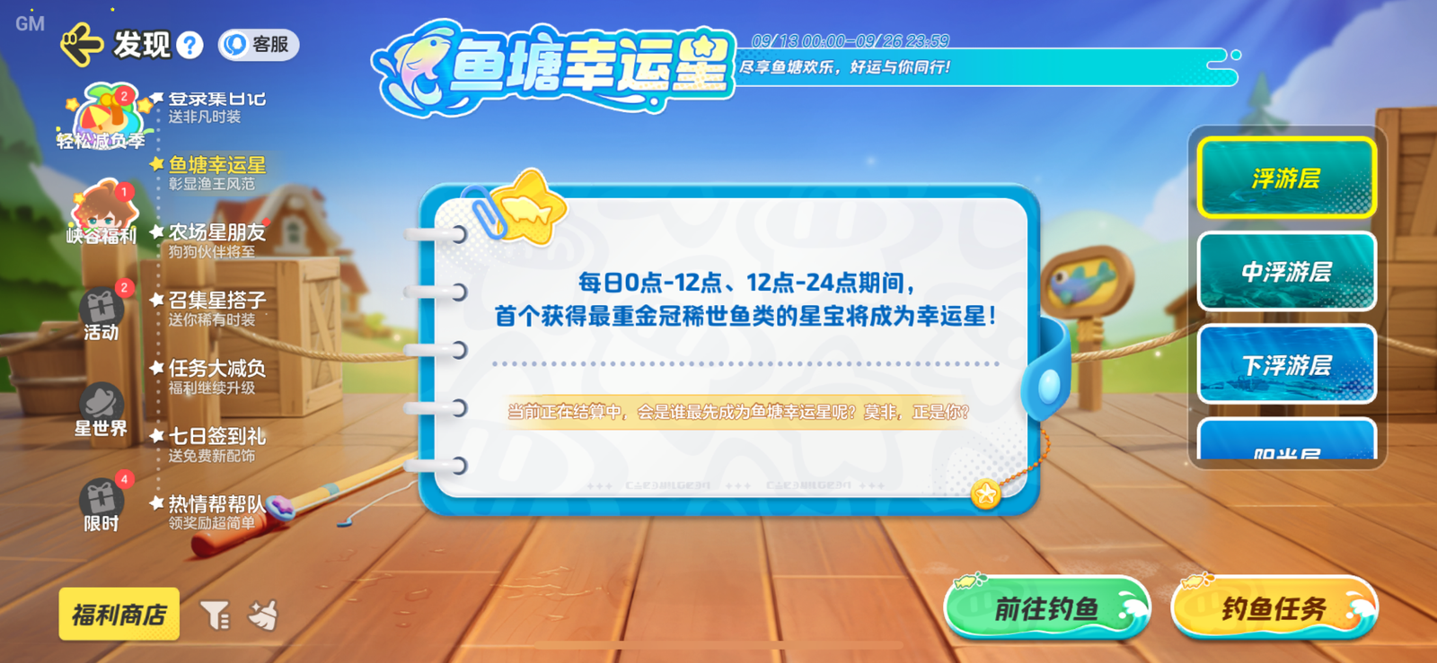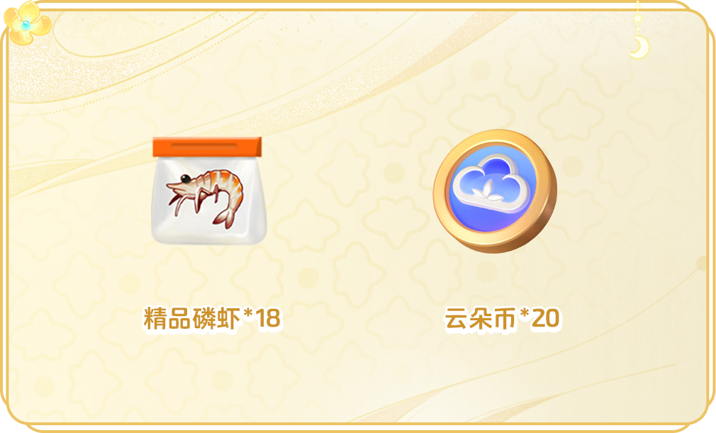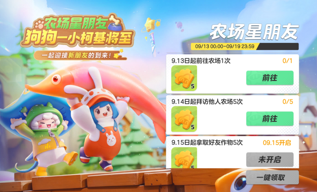 9月13日-9月26日,在星宝农场中完成钓鱼,气浪捕鱼等对应任务,可累计获得精品磷虾*18、云朵币*20,快去鱼塘钓鱼吧,鱼塘幸运星就是你!
