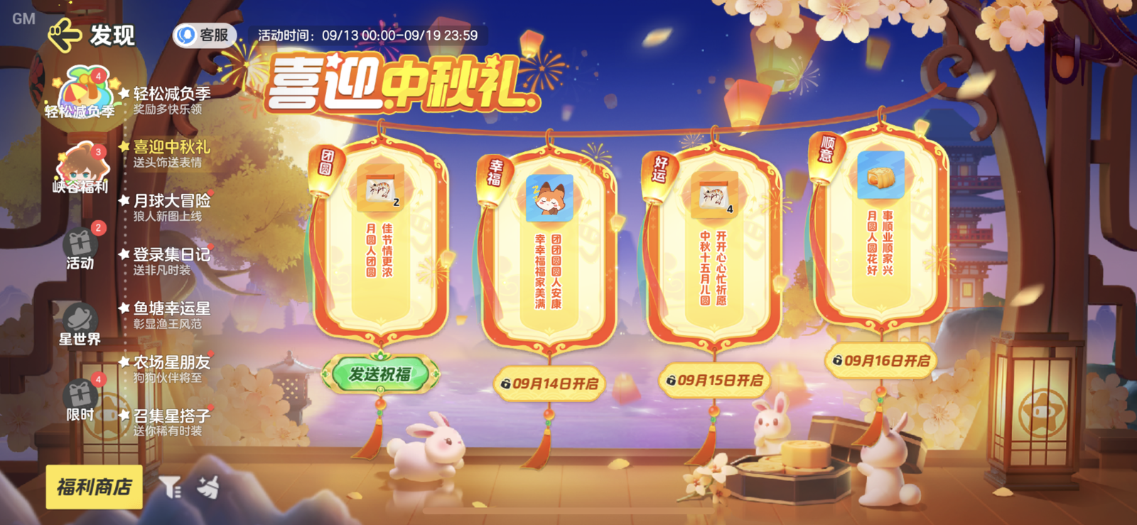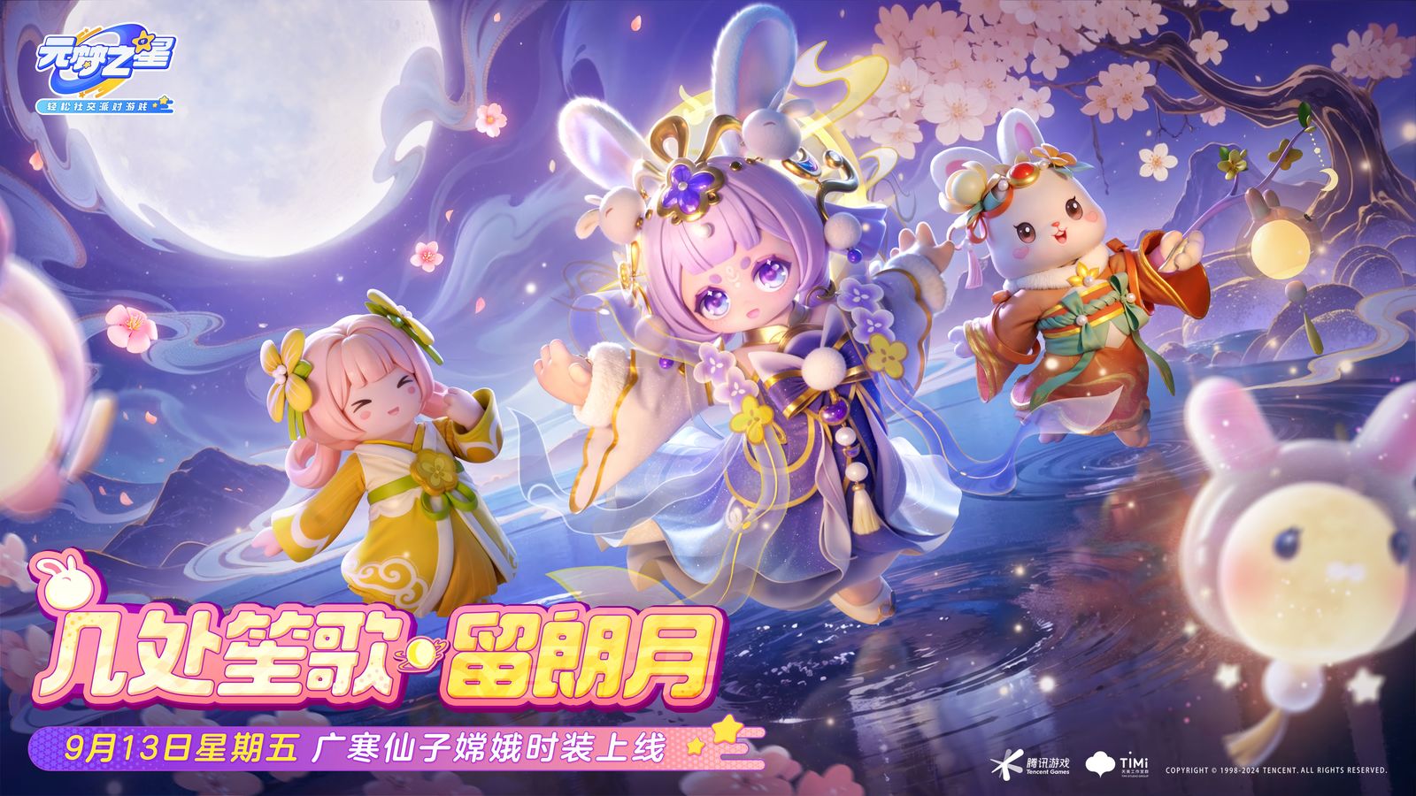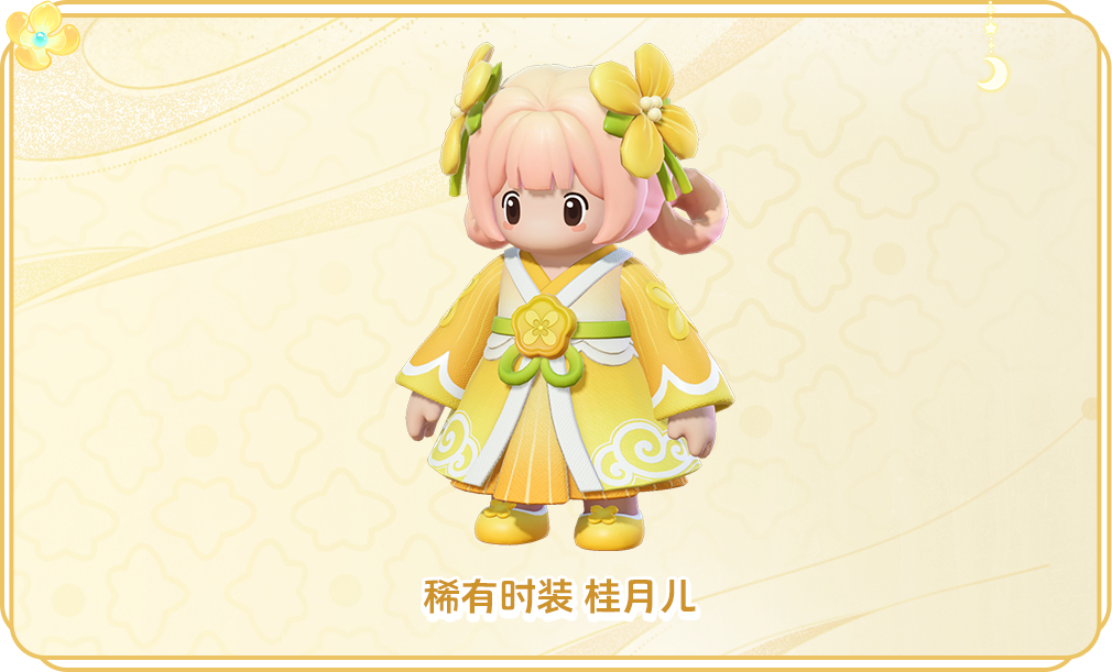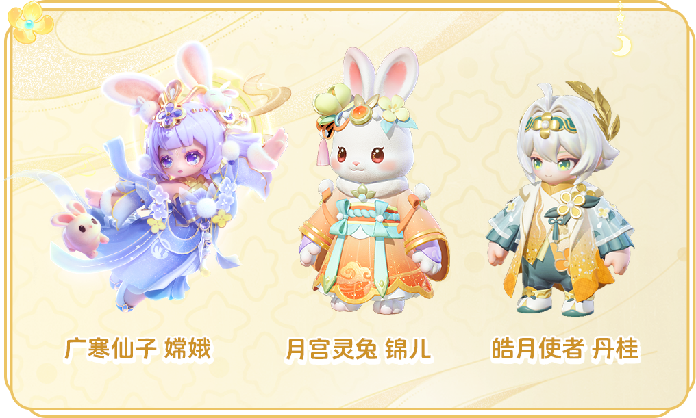 9月13日 起,享受桂月清平祈愿开启。嫦娥和玉兔邀请星宝们共赏秋桂,使用幸运币首次祈愿免费,首次祈愿十次享5折优惠!祈愿即有机会获得时装:广寒仙子 嫦娥月宫灵兔 锦儿、皓月使者 丹桂