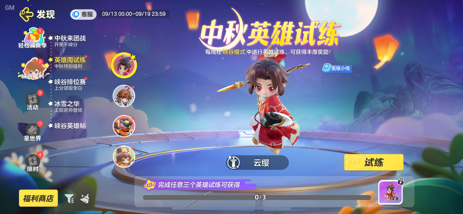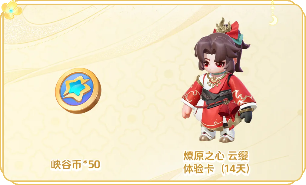 中秋福利再加码,9月13日-9月19日,完成英雄:云缨、李白、铠、蔡文姬的试练任务可领取峡谷币*50、不同品质的宝箱,以及云缨局外皮肤体验卡(14天)。