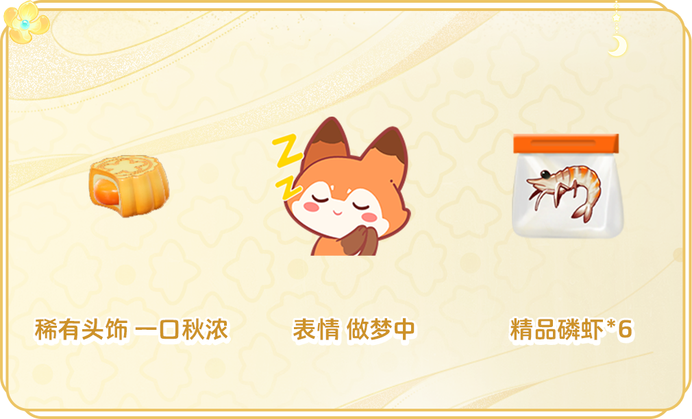9月13日-9月19日,欢天喜地迎中秋,活动期间完成对应任务,可获得稀有头饰 一口秋浓,表情 做梦中以及精品磷虾*6