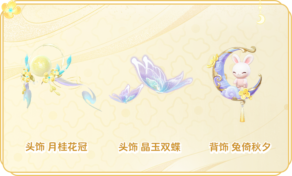 除此之外,本次祈愿还可获得,头饰 月桂花冠、晶玉双蝶,以及背饰 兔倚秋夕。