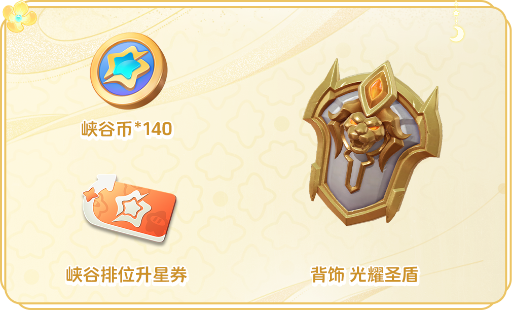 团队战根据累计的团战值,可共计兑换峡谷币*140、不同品质宝箱,以及背饰 光耀圣盾,星宝们根据峡谷模式对局次数,依次获得相应数量的峡谷排位升星券。