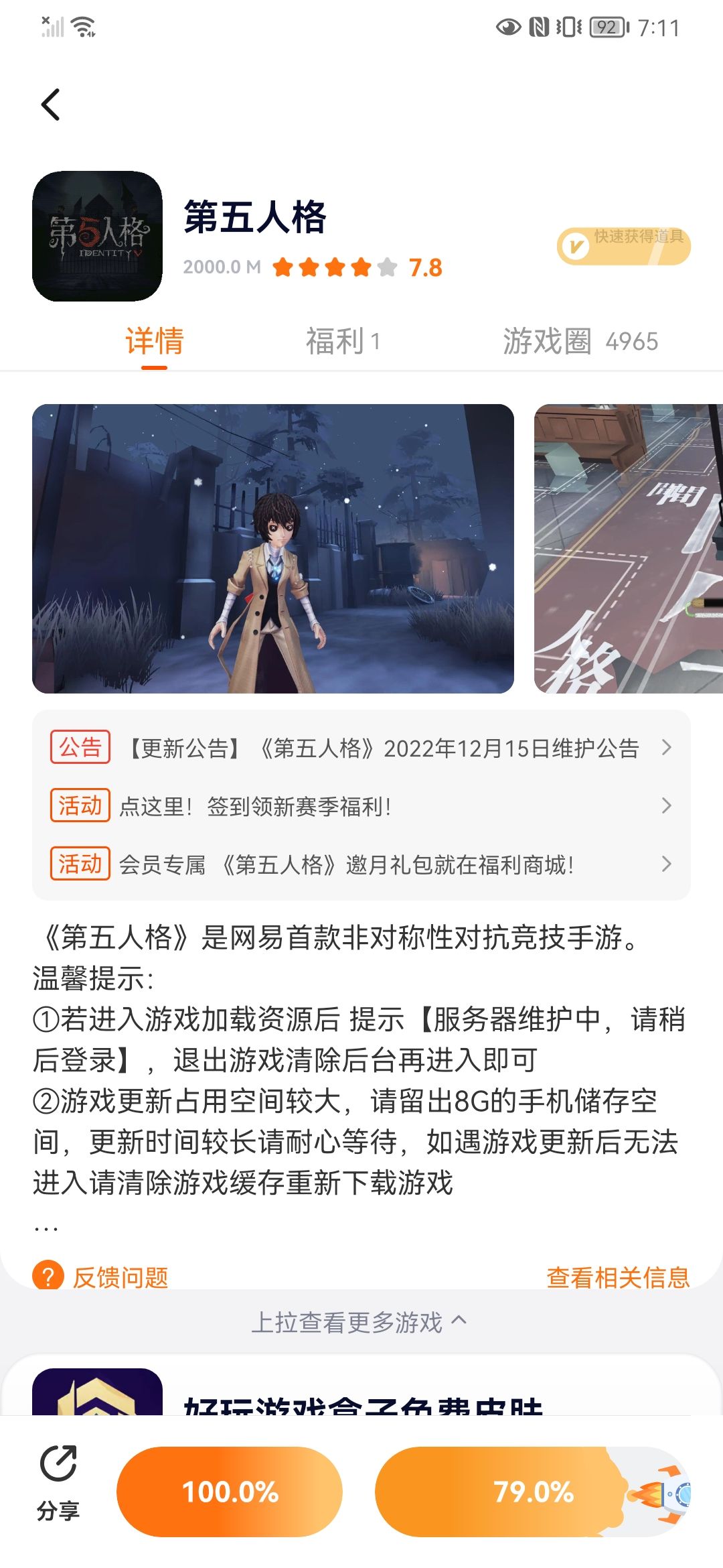 9月12日凌晨0点10分-上午10点10分停服维护更新,具体维护结束时间以游戏内开服时间为准。 更新:“银月下的传说夜”主题活动开启,参与活动即可获得【独特时装】先知-叙月人。 ☆ ---------------- 温馨提示: ①本包体使用233乐园账号登录游戏。 ②若进入游戏加载资源后 提示【服务器维护中,请稍后登录】,退出游戏清除后台再进入即可 ③游戏更新占用空间较大,请留出8G的手机储存空间,更新时间较长请耐心等待,如遇游戏更新后无法进入请清除游戏缓存重新下载游戏 ☆ ---------------- 《第五人格》是网易首款非对称性对抗竞技手游。 荒诞哥特画风,悬疑烧脑剧情,刺激的1V4对抗玩法,都将给玩家带来全新的游戏体验。玩家将扮演侦探奥尔菲斯,在收到一封神秘的委托信后,进入恶名昭著的庄园调查一件失踪案。在进行证据调查过程中,玩家扮演的奥尔菲斯将采用演绎法,对案情进行回顾。在案情回顾时,玩家可以选择扮演监管者或逃生者,展开激烈的对抗。而在调查的过程,无限接近事实时,却发现越来越不可思议的真相。