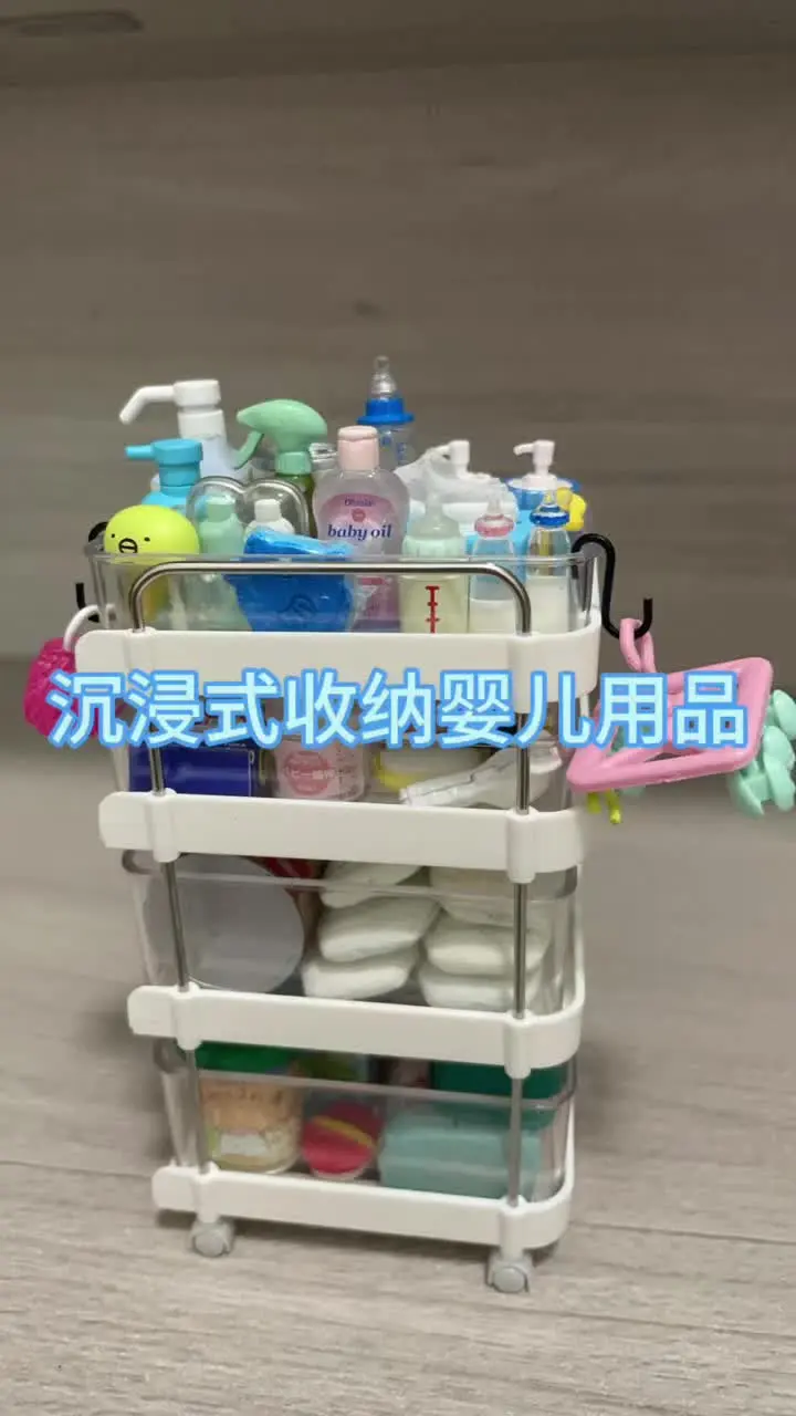 这是一则微缩婴儿房的沉浸式收纳展示,通过壁挂置物架等工具,将各类微缩婴儿洗护用品有序收纳,完成婴儿房的布置,呈现出整洁的微缩婴儿房场景。