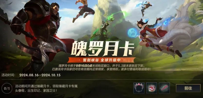 魄罗月卡暂别峡谷,全球升级中!魄罗月卡将于9月16日0点关闭购买窗口,并于5.3版本更新后下架。已激活月卡的召唤师仍可在有效期内正常领奖、享受特权。